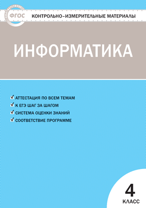 • Аттестация по всем темам • К ЕГЭ шаг за шагом • Система оценки знаний • Соответствие программе Представленные контрольно-измерительные материалы (КИМы) для 4 класса тематически сгруппированы, соответствуют требованиям школьной программы по информатике и требованиям ФГОС. Использование КИМов позволит оценить уровень усвоения обучающимися материала по каждой теме, а также подготовить их к тестовой форме проверки знаний, что поможет в дальнейшем успешно выполнить задания итоговой аттестации. В конце издания представлены ответы ко всем заданиям.